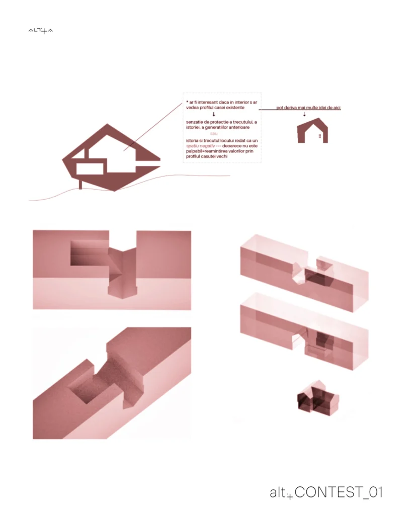 Construcția existentă este reinterpretată prin absență. Golul fostei cabane devine memorie activă; volumul se organizează în jurul acestui gol, între apă și peisaj.