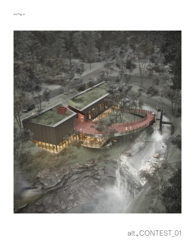 O arhitectură simbiotică – parte a parcursului apei, inserată în versant și în traseul cascadei.